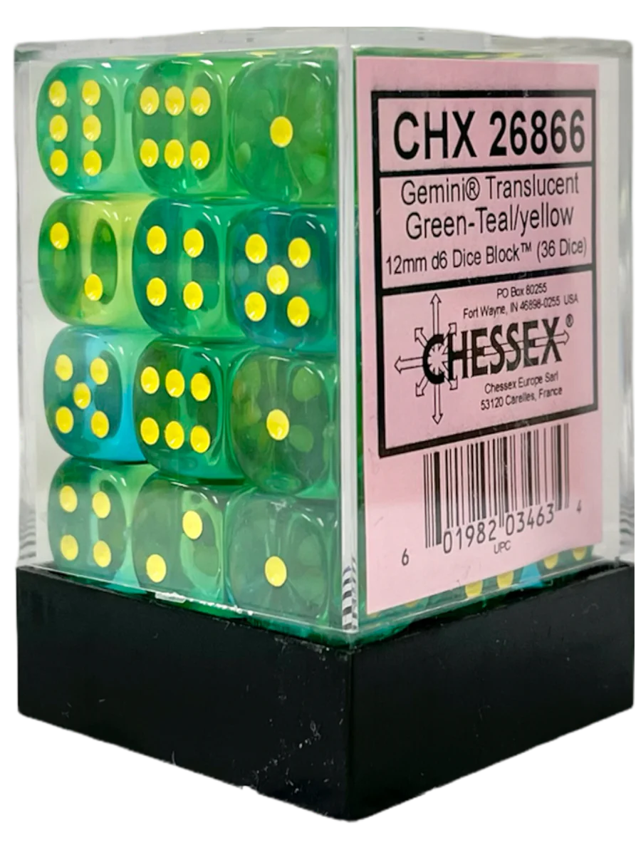 Chessex Gemini 36D6 Translucent Green-Teal/Yellow - 12mm