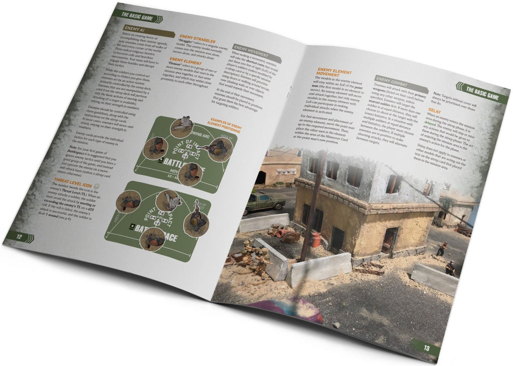 Softcover booklet with 48 pages, 34 Soldier cards, 18 Enemy cards, 29 Sitrep cards, 21 Gear cards, 2 Maneuver cards, Soldier Tracking sheets, tokens