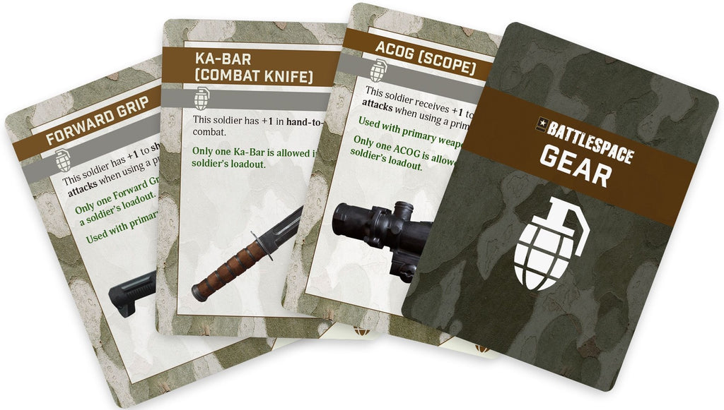 ● 21 GEAR CARDS from grenade launchers and drones to Caesar the Attack Dog. Plus tokens, soldier tracking sheets, and 2 Maneuver Cards."