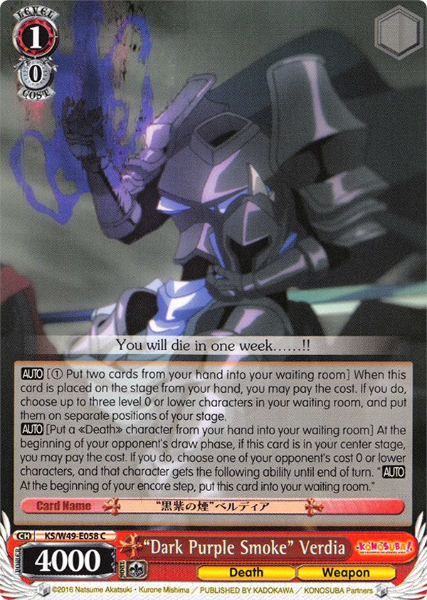 [AUTO] [(1) Put two cards from your hand into your waiting room] When this card is placed on the stage from your hand, you may pay the cost. If you do, choose up to three level 0 or lower characters in your waiting room, and put them on separate positions of your stage. [AUTO] [Put a "Death" character from your hand into your waiting room] At the beginning of your opponent's draw phase, if this card is in your center stage, you may pay the cost. If you do, choose one of your opponent's cost 0 or lower characters, and that character gets the following ability until end of turn."[AUTO] At the beginning of your encore step, put this card into your waiting room."