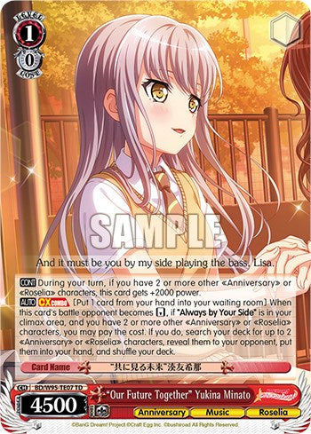 [AUTO] [CXCOMBO] [Put 1 card from your hand into your waiting room] When this card's battle opponent becomes [REVERSE], if"Always by Your Side" is in your climax area, and you have 2 or more other "Anniversary" or "Roselia" characters, you may pay the cost. If you do, search your deck for up to 2 "Anniversary" or "Roselia" characters, reveal them to your opponent, put them into your hand, and shuffle your deck.